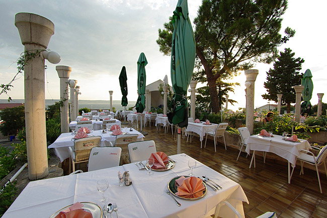 Restaurant: this award-winning restaurant offers local dishes from traditional Dalmatian cuisine, ancient recipes based on herbal plants from Velebit, vegetarian and classical dishes prepared by the chef. Some specialities are the "Ancient marinades" of oily and white fish served as a cold appetizer, seafood dishes (several types of mussels, shrimp, calamari and fresh white fish from the Adriatic), lamb and veal, steak combined with shrimp and all kinds of meat grilled on charcoal. The restaurant has won numerous awards and was listed among the top 100 restaurants of Croatian in 2007, 2008, 2009 and 2011.