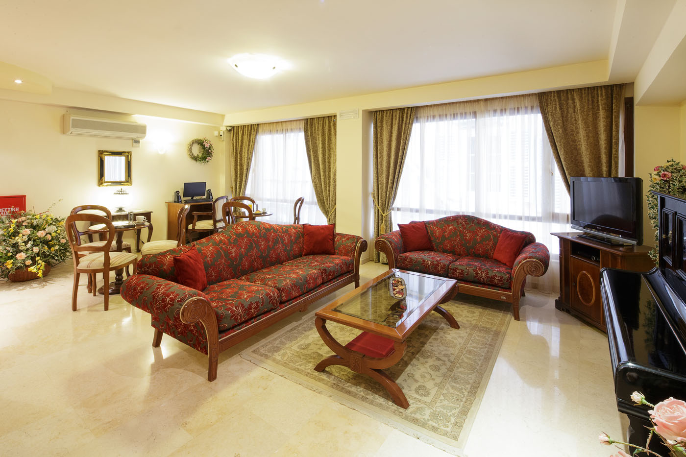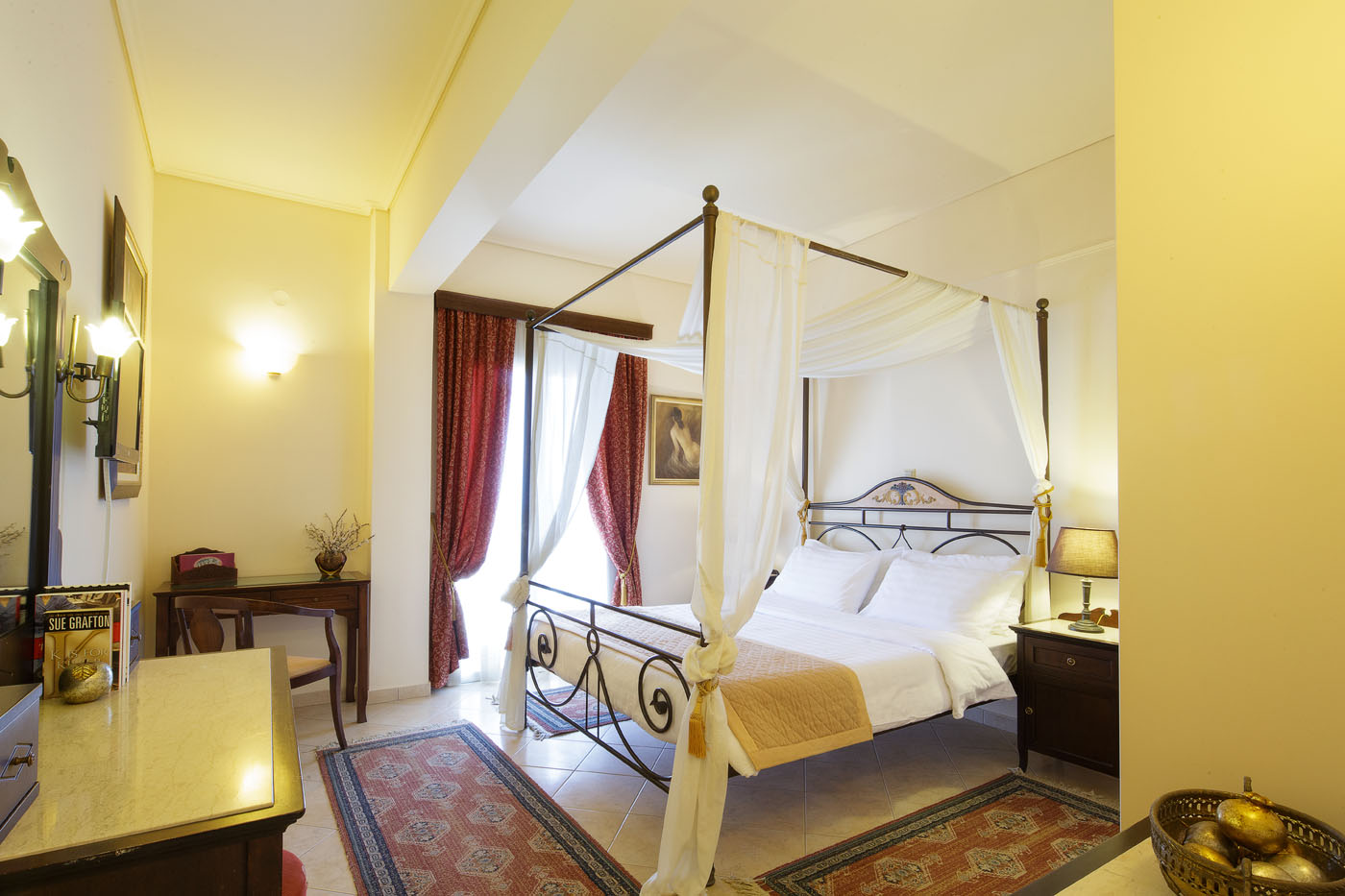 • Junior Suite (30sqm) features one of the best views of Corfu Town as the private balcony looks right onto Spianada Square and the Liston. The Junior Suite features a large bedroom with double bed and separate living room.