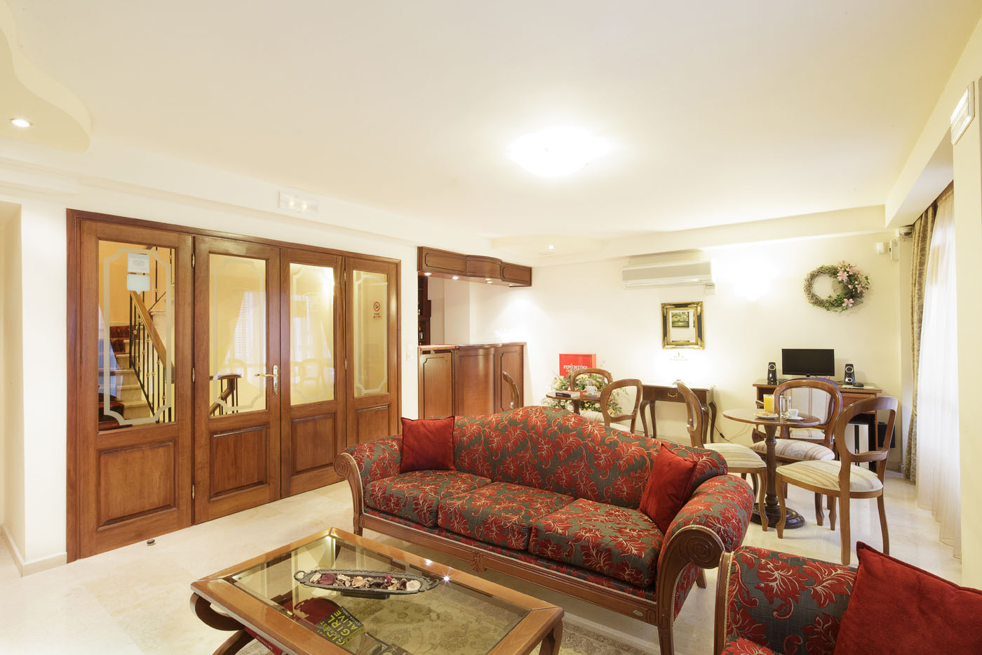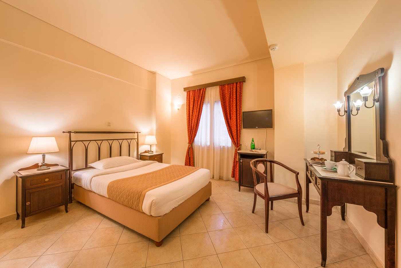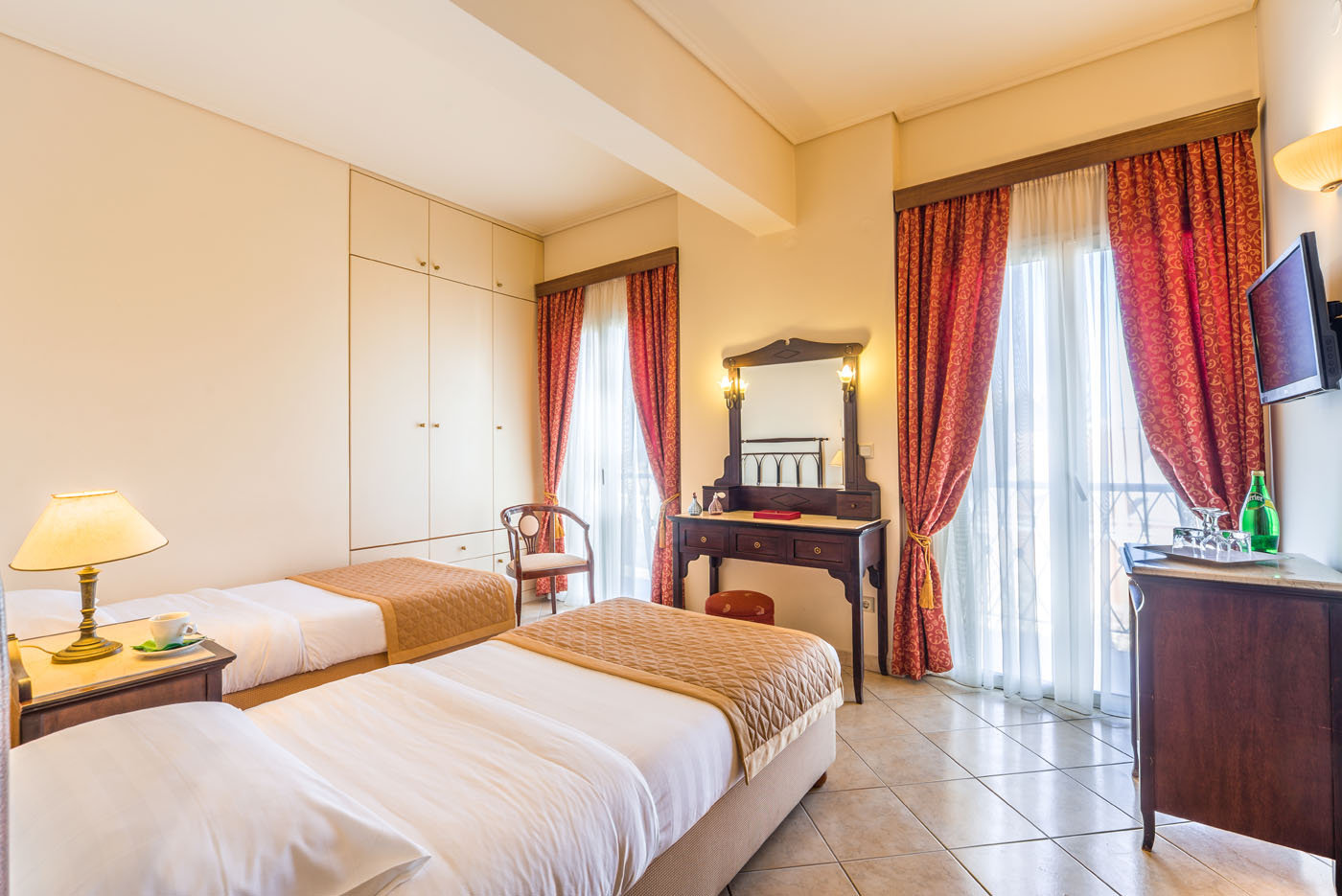All 33 rooms are en suite with air conditioning, heating, wifi, satellite flat screen TV, mini-bar, hairdryer, safety deposit box, slippers. Front rooms enjoy sweeping views of the Old Fortress and Spianada Square. Side and rear rooms look onto the characteristically tall and narrow streets of Corfu Town called “Kandounia”.