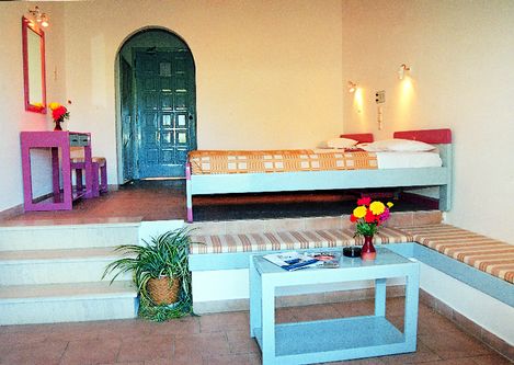 The hotel has 27 rooms, each with their own individual entrance, which are arranged in three different buildings. They are tastefully decorated and equipped with twin beds, a split-level seating area, shower/WC, a telephone, music channel, and a balcony with magnificent views over the mountain landscape, and the valley of Matala, which stretches all the way to the sea. Some of the rooms have air conditioning (extra local charge).