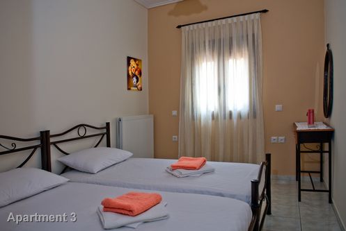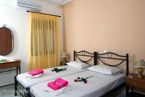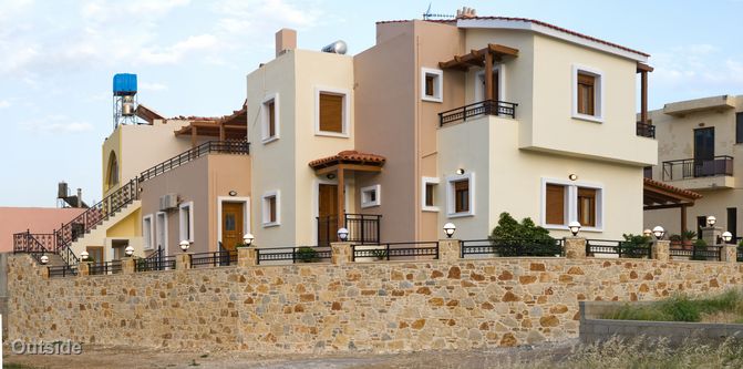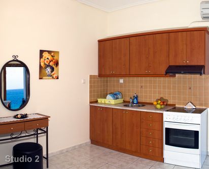 A: Two studios (18-22sqm), for two people, having a living/bedroom with twin beds, kitchenette, shower/WC and veranda with sea views.