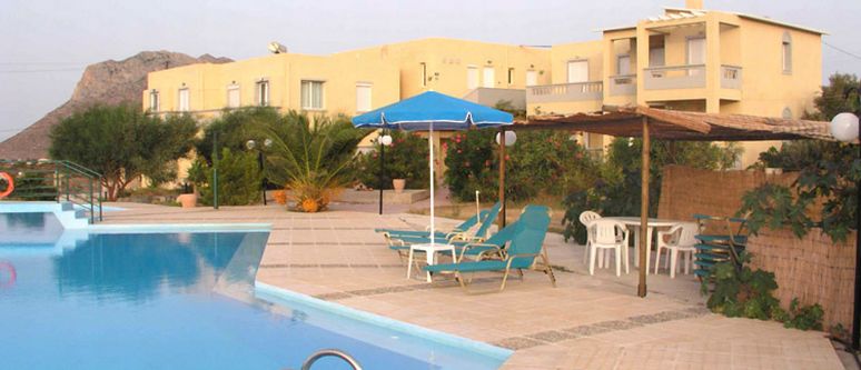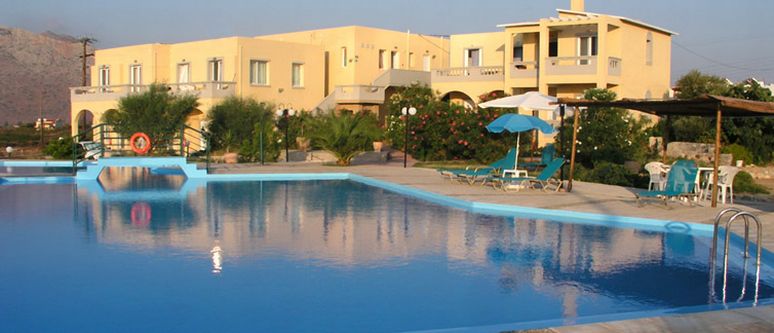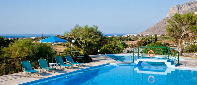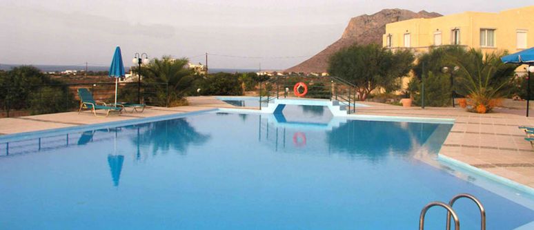 Facilities include a reception area and BBQ area. The 180 sqm swimming pool with a 40 sqm children's pool, is surrounded by sun beds and sun umbrellas. The sandy beach of Stavros is 1.5 km away and the sea only 500m away.