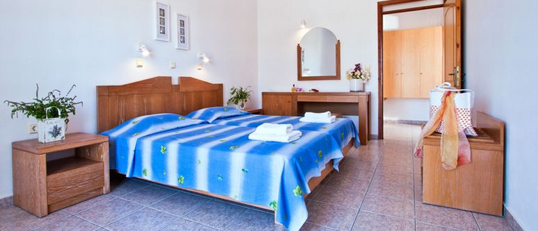 C : One apartment ( 70 sqm ) for 4-6 people, with two bedrooms ( twin beds ), simple kitchenette, living/dining area with sofa bed ( an extra camp bed can be added ), and shower/WC. There is a large shared terrace with sea views.