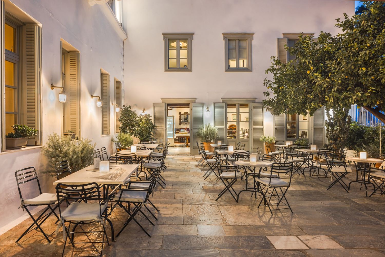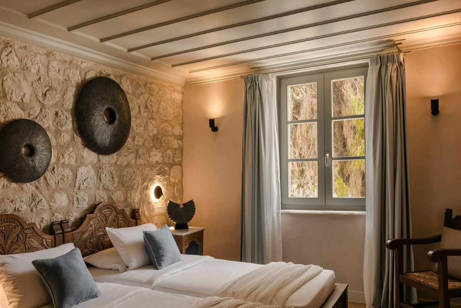 Junior suite (35sqm) is suitable for a family with a maximum capacity of up to 2 people and 1 child. It boasts views from all 3 sides facing Votsi Square and has a double bed and a sofa bed. The bathroom is lined with marble and features a bathtub.