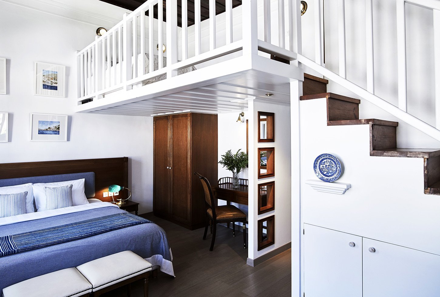 • Premium Suite is a double height spacious suite offering views to Hydra town. It features a king size bed and sitting area on the ground floor with solid oak floors, twin beds on the mezzanine floor, a state of the art bathroom with big windows, mosaic tiles and twin wash basins. Perfect for families with young children, this beautiful suite can accommodate up to two adults and two children.