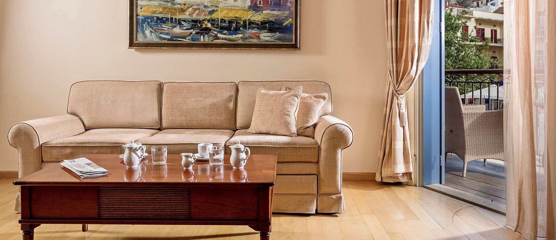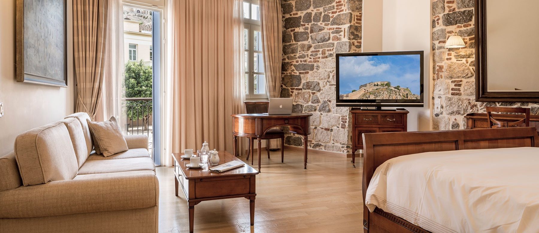 The 40m2 Suite offers a sitting room and a balcony with panoramic views of Palamidi Castle, Acronafplia Walls and Syntagma Square.