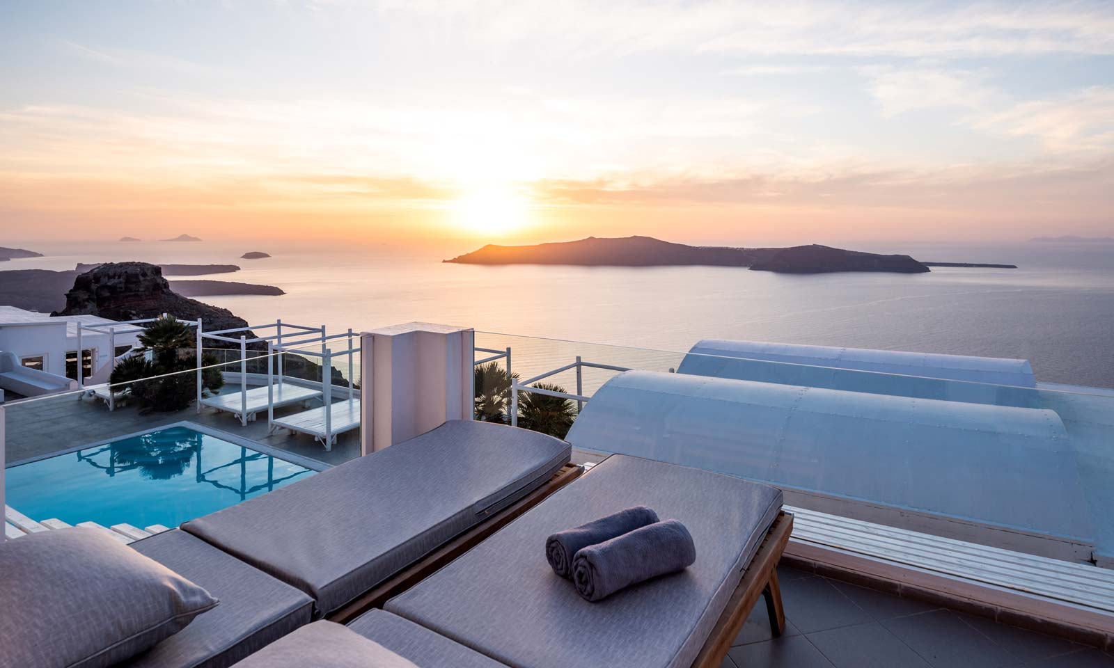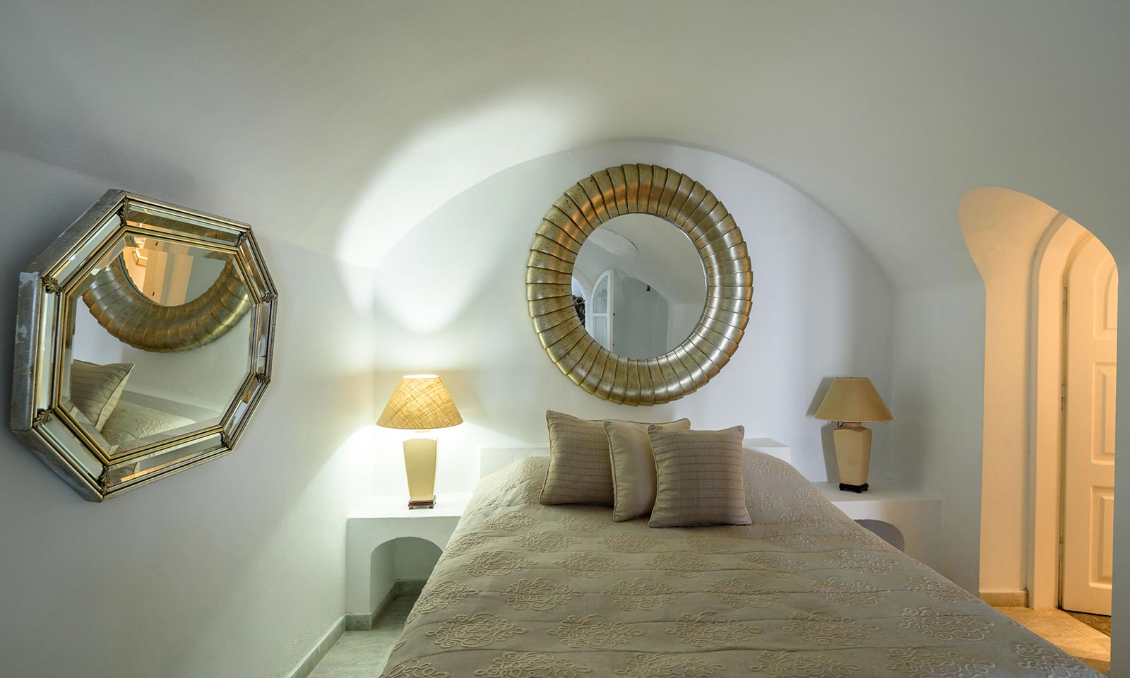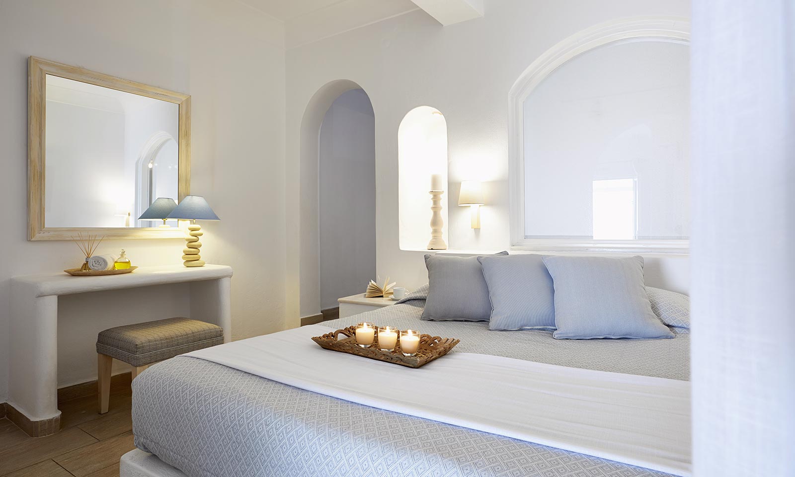 - Honeymoon Suite - one bedroom with double bed, one sofa bed in the living room, private large veranda with dining area and outdoor heated plunge pool with caldera view. A la carte breakfast is served daily in the suite with no time limitations.
