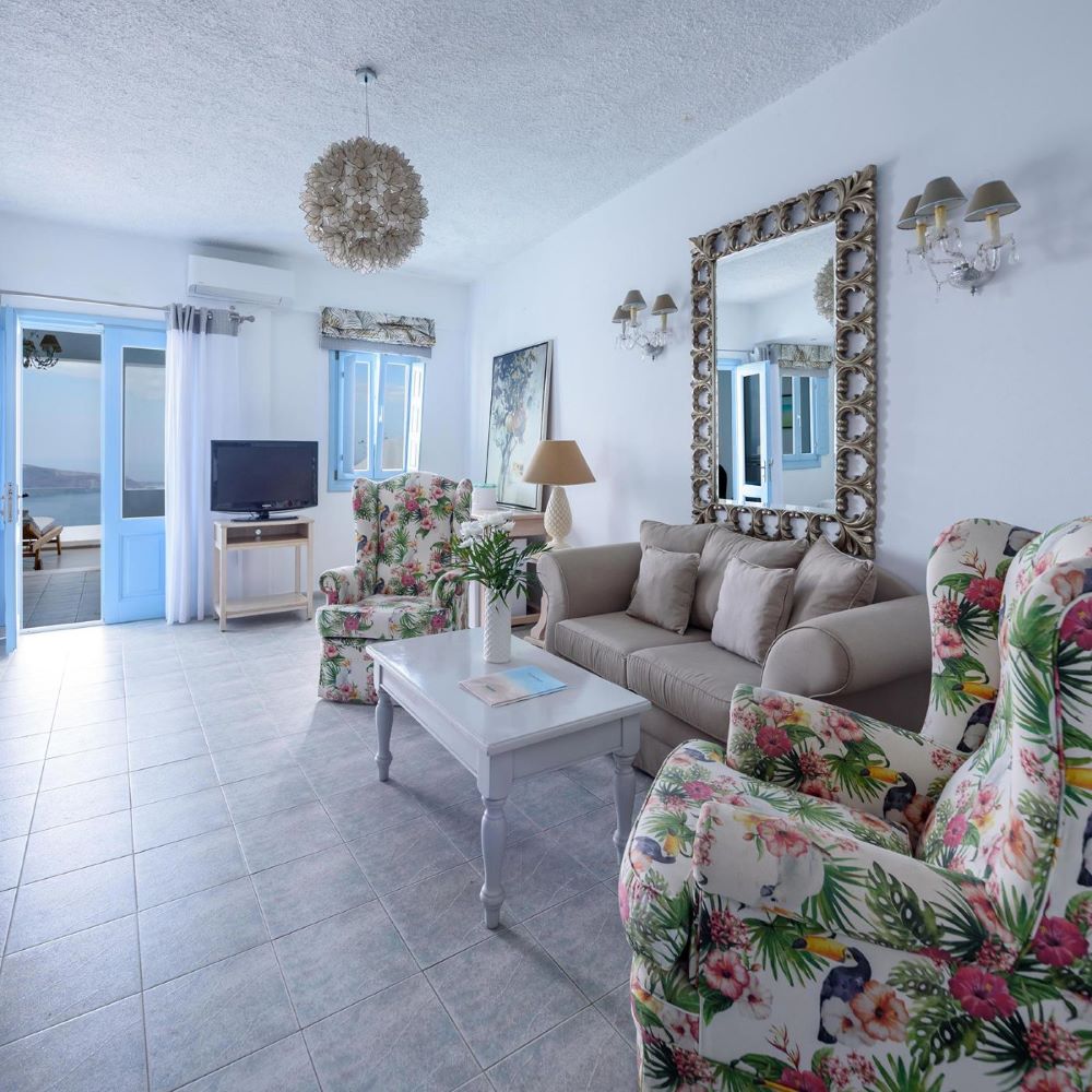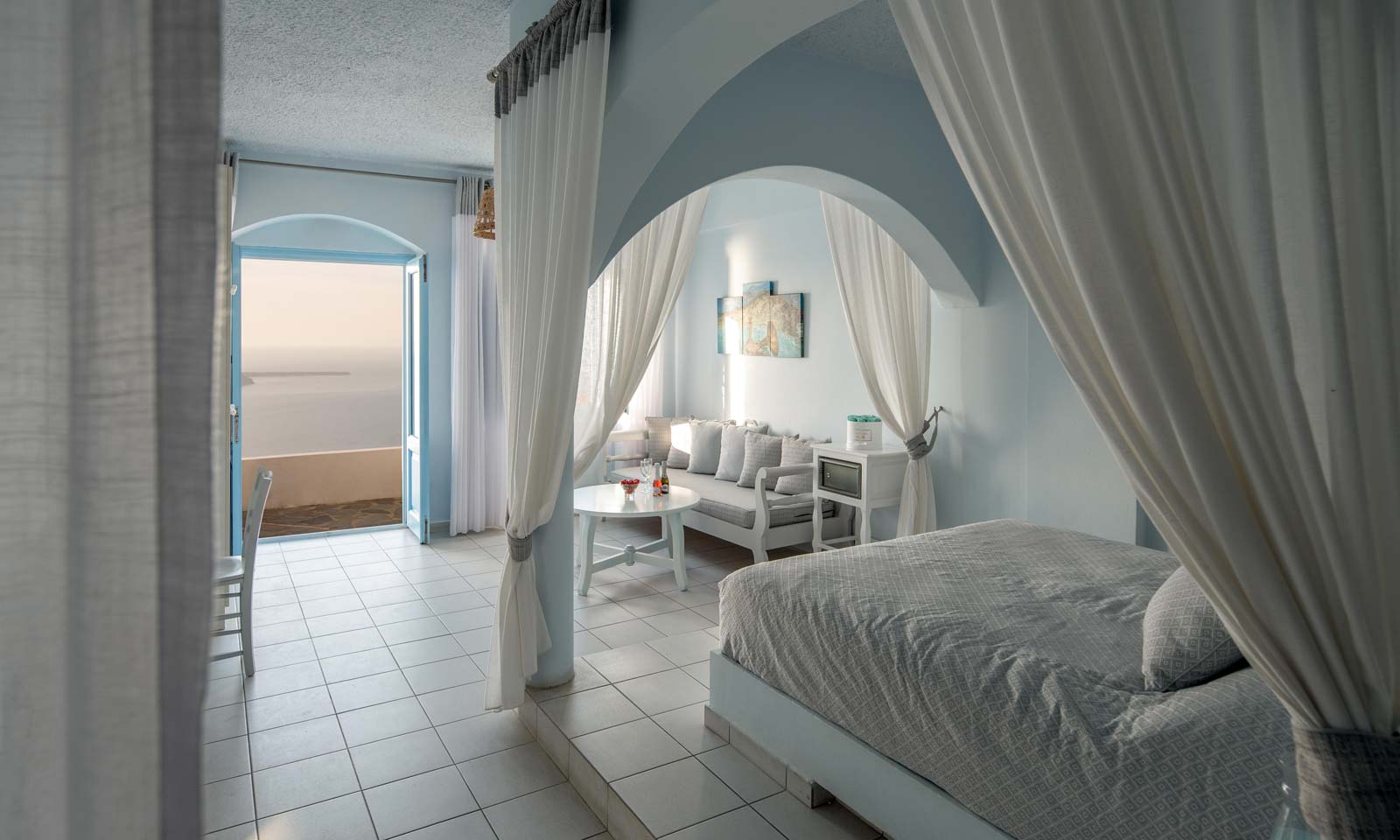 - Junior Suite - double bed & sofa bed for the third person, sitting area, private furnished balcony with caldera view.