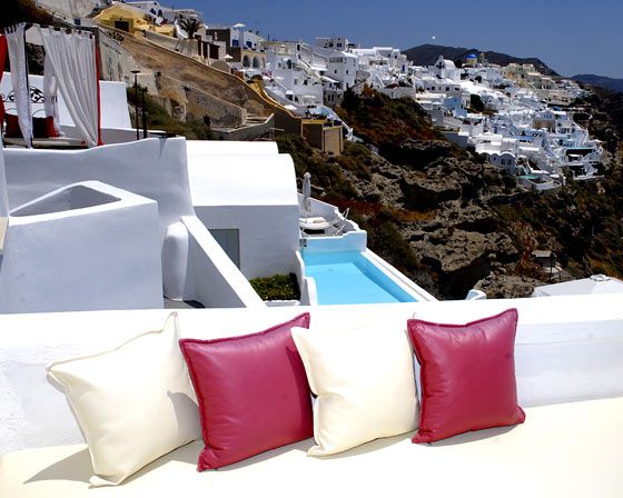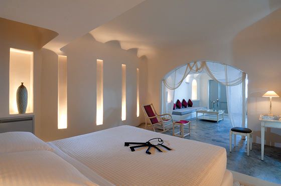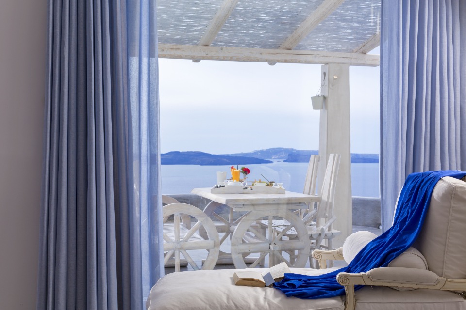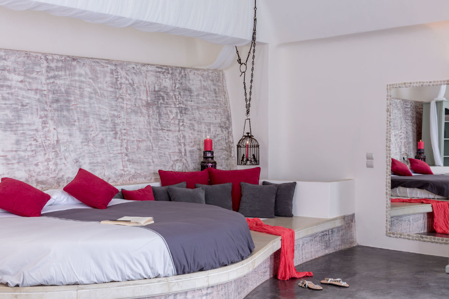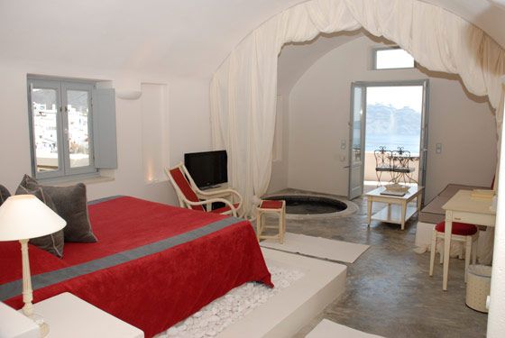 - The open plan Grande Suite of 45 m2 offers a capacious king size bedroom and an elegantly adorned living room with indoors Jacuzzi, a spacious bathroom with shower, spacious private veranda with incredible views of the Caldera.