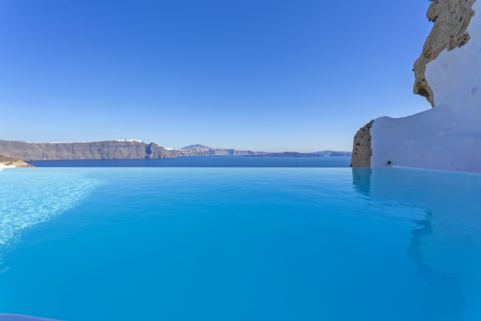 - Cave Pool Suite: Discover a new level of luxury in our Cave Pool Suite. Pamper yourself in every possible way as you enjoy the luxury amenities. The outdoor cave swimming pool will delight you as you dive into its fantasy world. The private balcony with its own sun loungers will capture your heart with the amazing Aegean Sea view. The Cave Pool (40m2) is beautifully decorated with a spacious living room, a comfortable bedroom and shower.