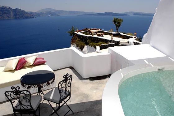 - Deluxe Suite with Outdoor Jacuzzi: Deluxe Suites are designed in a size of 65 m2, with a relaxing private outdoor Jacuzzi overlooking the Aegean Sea ,spacious Bedroom and living Room, bathroom with shower, spacious verandas perfectly orientated to the most astonishing and romantic sea view of Santorini. *The Deluxe Suite can accommodate up to 3 persons at additional charge.
