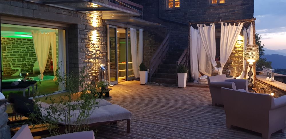 • Master Suite (50sqm)  – also at the highest point of the hotel complex, surrounded by forest with views to the villages and mountain. Two levels with bedroom on the ground floor in front of the fireplace, wooden loft lounge area, jacuzzi. Suitable for 4.