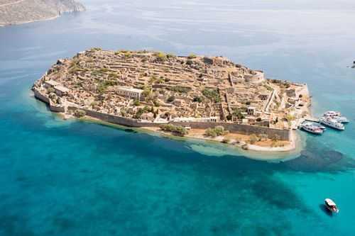 The actual harbour is naturally well protected by a long peninsula and the island of Spinalonga, a former leper colony.
