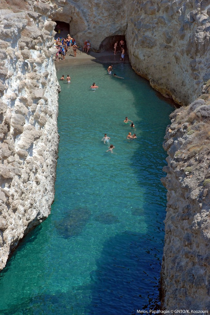 Named after a Catholic priest who used to moor his boats there the caves of Papafrangas were possibly used as pirate hide-outs centuries ago. There is a small beach here, and the two caves are interconnected by an underpass.