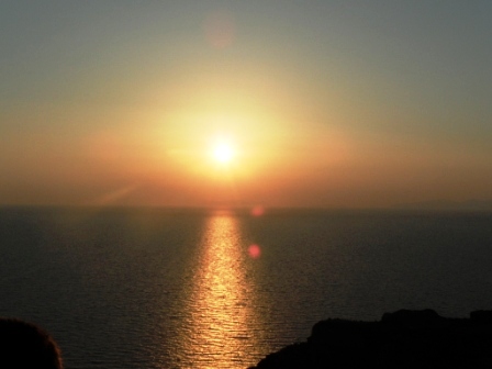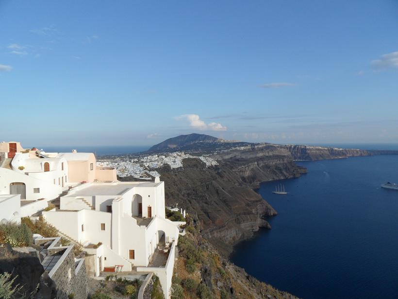 Santorini's history is as dramatic as its scenery. Originally its three islands were connected and were referred to as Strongilil (the round one). On the coast was a thriving city of 30,000 inhabitants and traders such as blacksmiths, stonecutters, shipbuilders, potters and weavers sent their goods all over the Eastern Mediterranean. However in 1645 BC a volcano erupted, the volcano walls caved in and the sea swept into the void which created a caldera (crater) 10km in diameter and 400m deep. The ensuing tidal waves destroyed coastal areas - many say this caused the demise of Minoan civilisation throughout the Aegean. Today it is possible to visit the remains of this once-thriving city, Akrotiri. You can visit the houses, storage areas, workshops and cookhouses. Archaeologists believe that only a small percentage of the city has been discovered, though no bodies have yet been found, leading them to believe that the citizens had advance warning of the eruption.